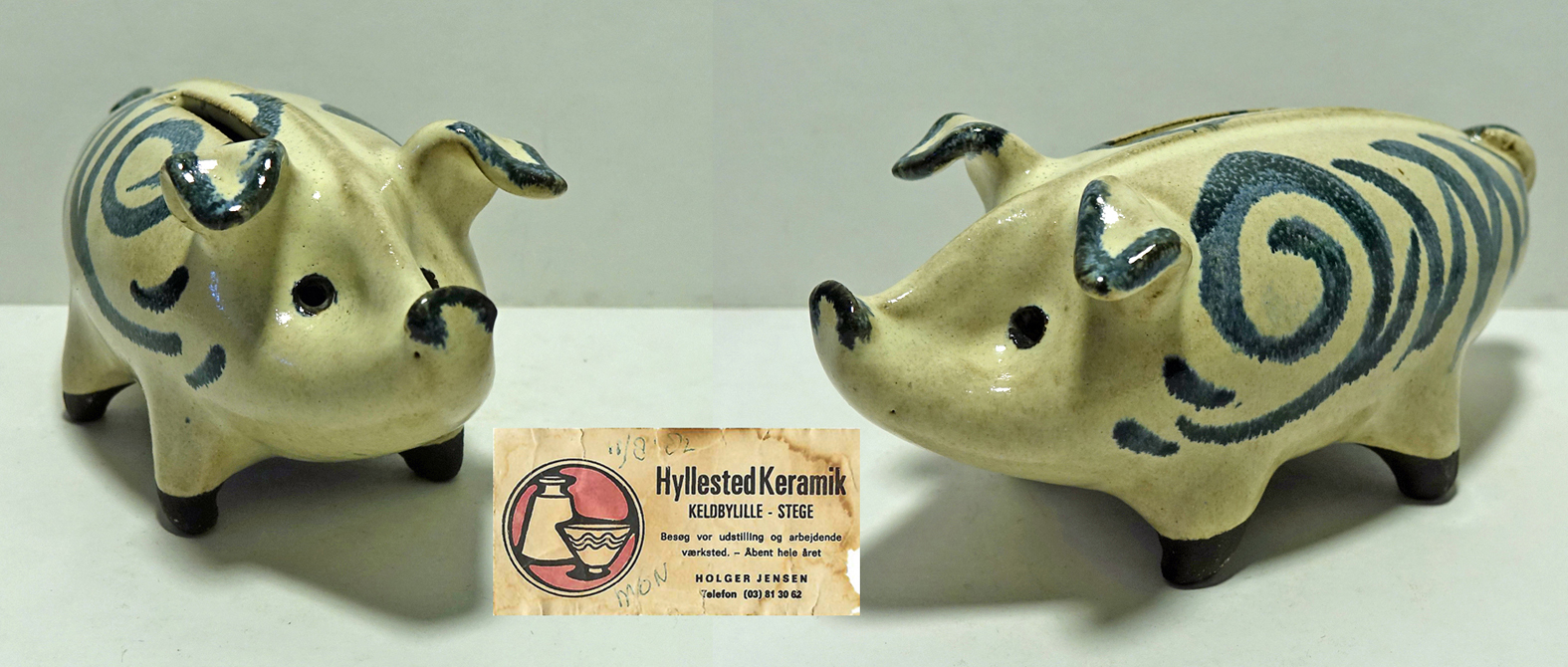 Including the small piggy bank below (length 12 cm) that caused me some headaches in terms of 'provenance'. That it belonged to Hegnetslund Lervarefabrik (1892-1991) seemed clear given the mark on the belly. But what meant: "Til nóset vi fare - derfore vi spare". By raising this on Facebook I found out that Nóset is the name of a large beach pavilion at Ebeltoft, called Nóset Strandgaarden. The translation of the edge lettering is therefore "We save to go to Nóset" [to party]. Period 1950-1960. Nóset management confirmed that this was a souvenir at the time. You could then show that you had been ER (like many generations before you). A typical 'conversation piece'.