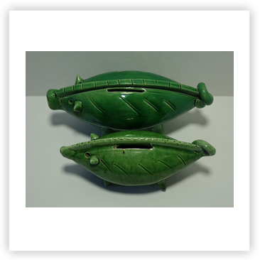 The fish shape? Originally they were folded from a round slab of clay. The diameter determined the length of the piggy bank. Fold the ends together, pinch the edge firmly (this creates the rib) and you almost have a piggy bank. Shape the head, put ears and 3 legs underneath, cut a coin slot in it. The hardest part is making the knot tail. This is possible with small quantities. In mass production, if there ever was one, a mould was used.