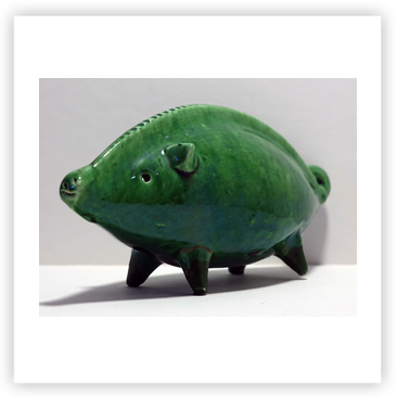Gouda: Most potteries which existed until the '60's were integrated in bigger firms or just vanished. The Gouda piggy bank had 4 legs, cross stripes on the body and a tail as a knot. It is green led glazed. Led glaze appears to be poisonous, so a EC regulation (± 1989) decided that this kind of glaze was forbidden. And a whole industry of ceramic household ware became extinct. Many Gouda piggy banks have a number that corresponds to a certain length. Unfortunately, there was no uniform system, all producers had their own numbers and sizes.