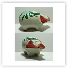 There are many types of pottery in Portugal, from traditional to modern. Red clay is often used as the basis. Portuguese potteries work in the traditional way, with great care for the finish, the colours and the designs. Throughout the country you will be surprised by tile panels on buildings and in old train stations. The Portuguese call these decorative tiles azulejos. They are often blue, which is strongly reminiscent of Delftware. About Portugese pig piggy banks of banks in general there is no further information on the internet available.