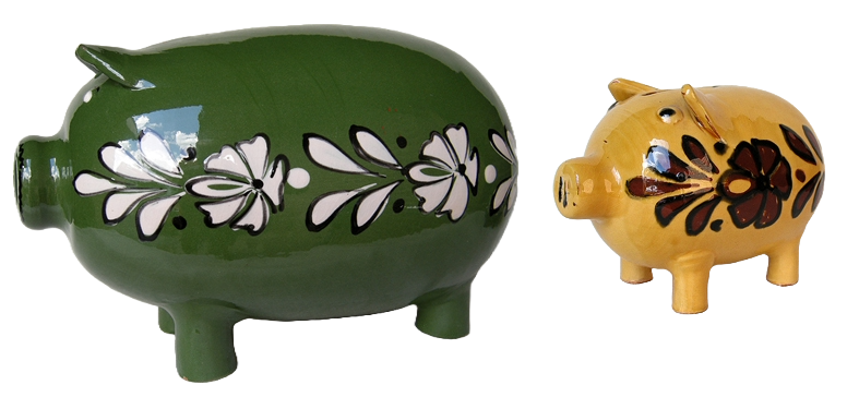 These piggy banks with flowers are from Eastern Europe. Romania and Hungary (and occasionally Bulgaria) were the suppliers of former department store V&D that sold them early 1970's in large quantities, along with flower pots and dishes. The flower decorations are hand painted. To create some system in the amount of flower decorated piggy banks I made two categories: 'small and medium' up to 16 cm and 'big' from 16 cm. The smallest is 9.5 cm and the largest in my collection is 29 cm. There are some misunderstandings about these kind of piggy banks: They are not antiques (there are possibly exceptions!) , since they are dated ± 1960-70. Not special pottery, but 'ordinary' farmers pottery, folk art. And that's OK!