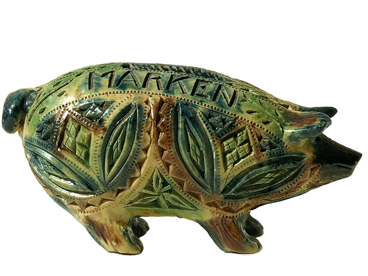 You rarely come across a Frisian carved piggy bank in these colors. I bought it from a collector with specialty “Lemmer”. He determined that this certainly did not come from Lemmer: “much too coarse”. Where from then? I have only seen this color scheme at “Velzer aardewerk” (1920-2002, last name Velzen Keramiekfabriek in Sassenheim). But does it come from there? Length 15 cm.