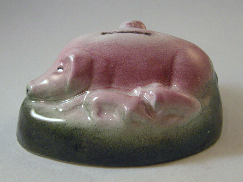- The oldest (13th century; amongst experts disputable!) European piggy bank was found in Billeben (Thüringen, Germany). Certain is that potters from the 17th century on produced clay money banks (also) in the shape of animals like a pig. Other craftsmen started to produce them in tin, metal, silver, etc. The industrial production of ceramic piggy banks, with moulds, started approximately in the middle of the 19th century.